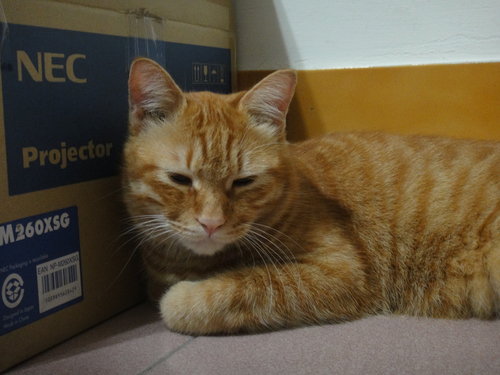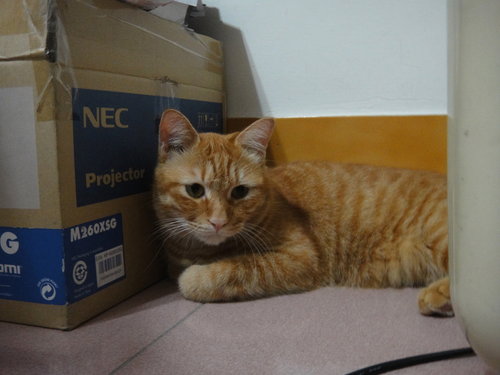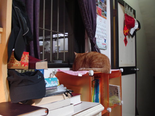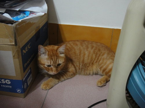 昨天下午雷聲大作,這貓像是做了天大的壞事般,怕被雷公打到,一副委屈不已的樣子,連走路都壓低身子,像是在爬行般,躲到我桌子底下,我心裏頭就在想,你又在搞自閉了,膽子真是小,不知你家老爸肥從小就不怕雷聲,不只不怕,而且還很喜歡呢!最好天下大亂,我最高興,所以每當閃電電雨,或是颱風來時,都是我特別興奮之時,阿橘啊!你只消有我百分之一,就不會怕雷聲了。