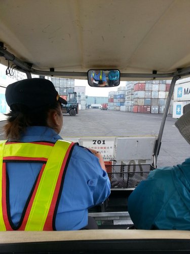 上頭這張照片是韓進海運78號碼頭的驗關車,是用高爾夫球電動車來帶人進碼頭,而長榮海運則是有他們公司的保全員開公司的箱型車進去,以前快桅公司也是,但長榮是進到貨櫃旁,門式機把貨櫃夾到車道上去,而快桅公司則是用跨載機夾到碼頭海邊去統一查驗,相對起來陽明海運就得等人到了後,機具才會起動去吊貨櫃,美國總統船公司因為他們的門式機是輪式的,而與長榮的軌道式的不同,加上他們的貨櫃場地較大,視野較大且在大型機具旁都有地面人員做安全維護,所以我們都可以自己開車輛進去,只要找到貨櫃位置,請他們地面人員呼叫操任人員去夾出貨櫃就好。