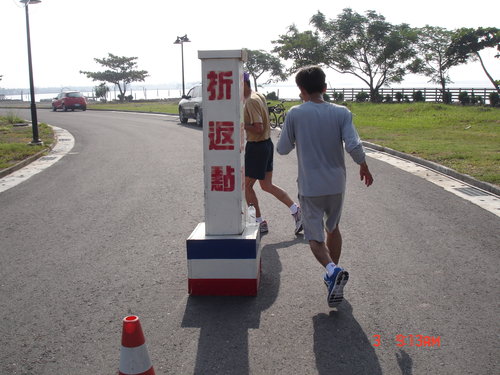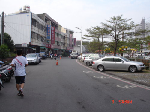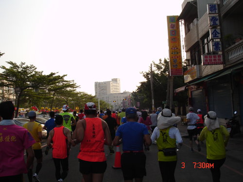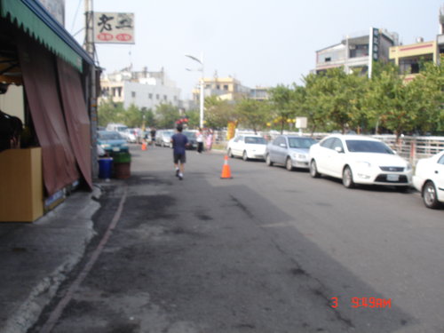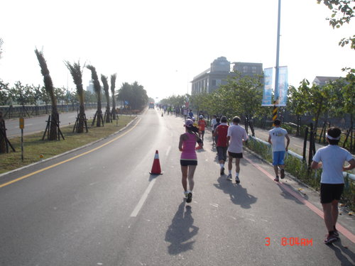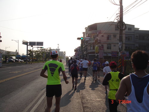 跑出東港的市區往林邊的方向去,心裏頭也覺得怎麼這麼遠,為何?因為腳不舒服啦,上回還沒有這問題,會不會過度操練呢?離里港馬也有二個星期了啊!也許是腳的乳酸堆積沒有消解掉而造成的,依我的經驗要跑一陣子才會消除這種不適感,但這還沒有消除之前的自己,卻又出現了難受的心情,又在責怪自己沒事又來參與這種折磨人的活動,還沒有跑五公里,這種心情不應是撞牆期吧!忍著再跑下去。