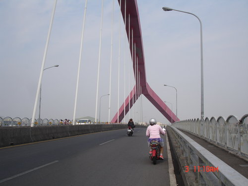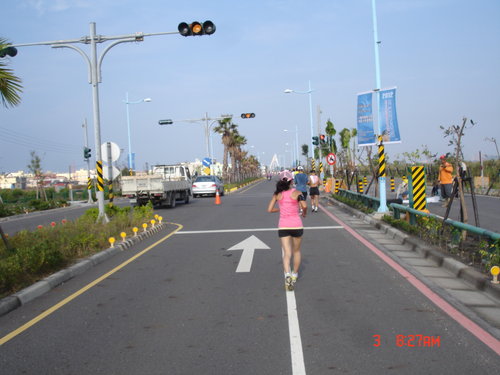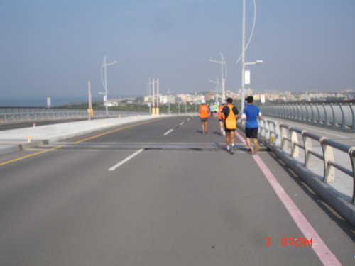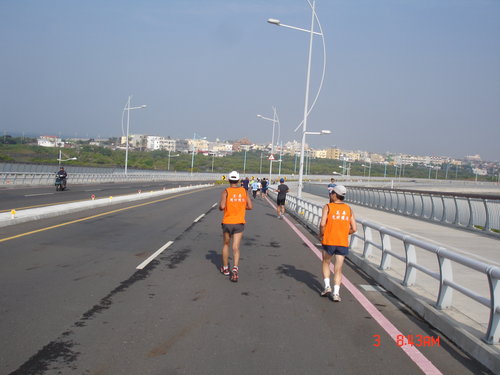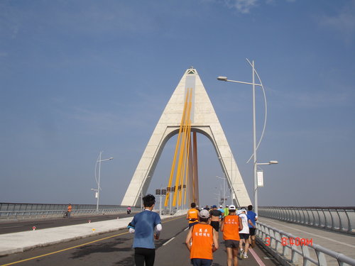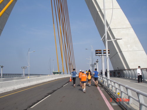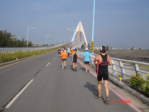 好不容易上了大鵬灣的景觀橋,也不知道內心受了多少折磨,但腳的不適感依然存在,雖然腳步不停息,還是打算不加快速度,穩健地跑較好,若像里港那一場跑死一個,其實不用這麼拚的,自己也知道再怎麼訓練自己也不可能是前二十個名次,輕鬆自在些依然是路跑策略。