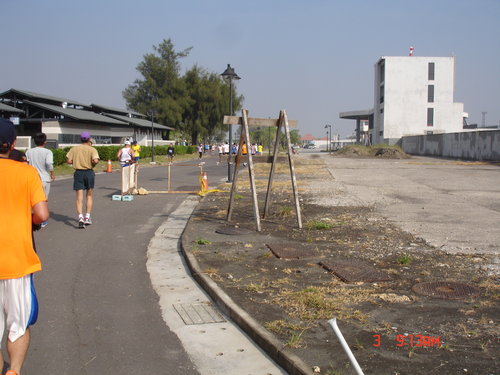 往這賽車場出口跑去,右邊的建築物內應是賽車跑道了吧!傳來機動車輛那快速度的引擎噪音,不時有重型機車快速騎過我們跑步的隊伍附近,這些人以為騎著重機很有傲氣,但我覺得我才是最有傲氣的,因為我們是勇者,靠著自己的雙腳,忍受著苦痛,這些騎著重機的人雖說外表亮麗,其體能不會有我們好的。