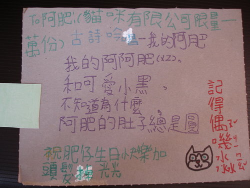 生日卡上還要我記得偶嘰淼,這個是黑綺貓的台語發音啦,我剛開始也看不懂,請教了小咪才知道答案,小咪啊!肥仔我對自己的生日沒有什麼要求要你們對我慶祝或是買禮物,要知道家裏的經濟來源是我,我想要的東西我都可以自己去買的,生日也可以請你們吃大餐,年輕時的肥仔可是一個節省成性的人,所以長久以來物質上的需求對我是沒有太強烈的感受,但身為你家肥仔老爸,生日的願望是希望你們二位小朋友平安長大就好,還有我那肥仔老婆,應叫肥婆吧!若能天天叫她來開店就好,小黑貓老闆來開店,比起你這貓咪服務員來開店還要有效的喔。