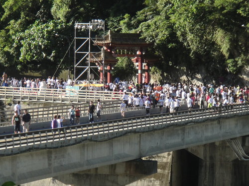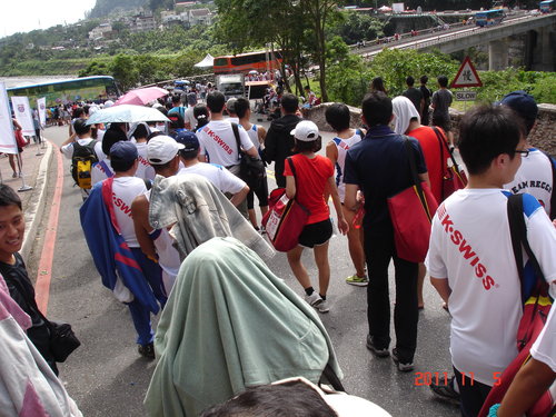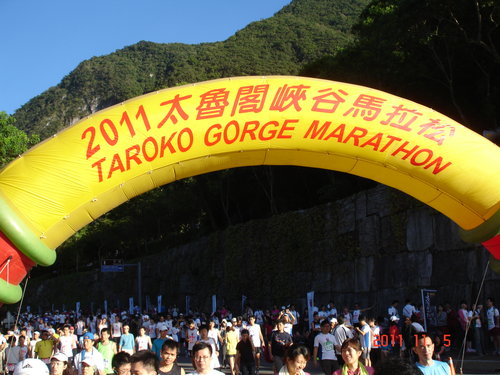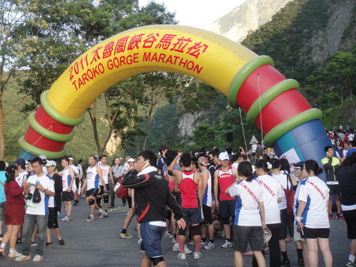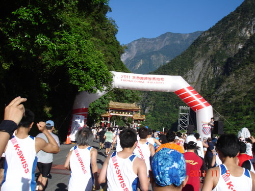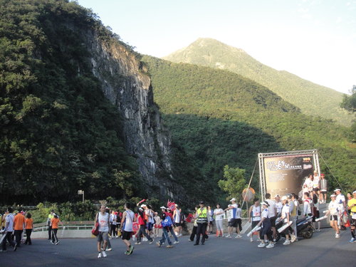 遠看東西橫貫公路牌樓前,跑者逐漸聚集,而我還在等廁所,真是急死人了。