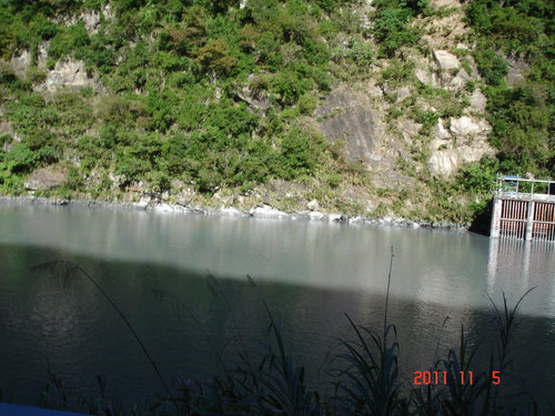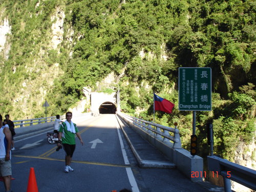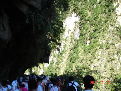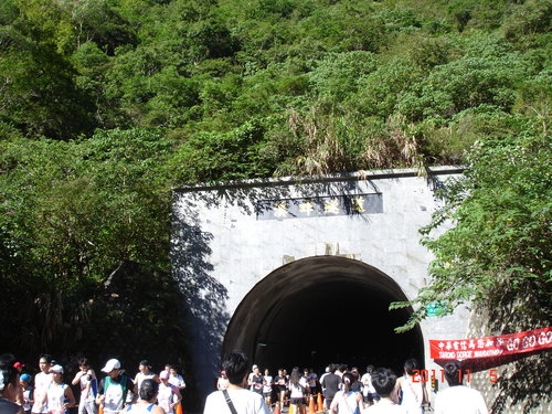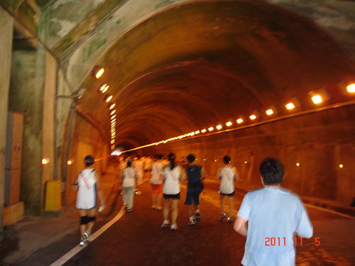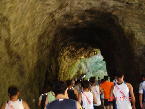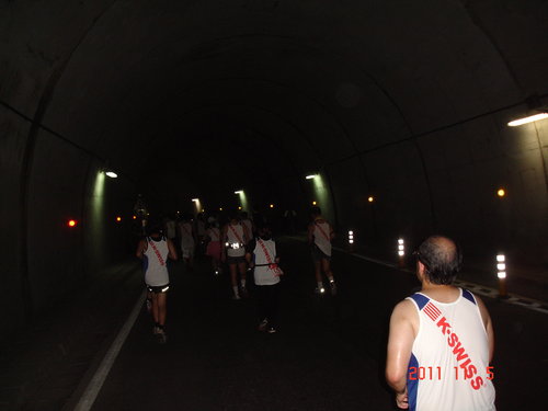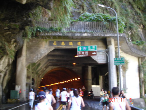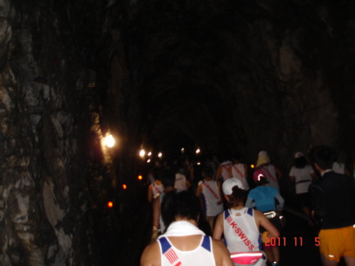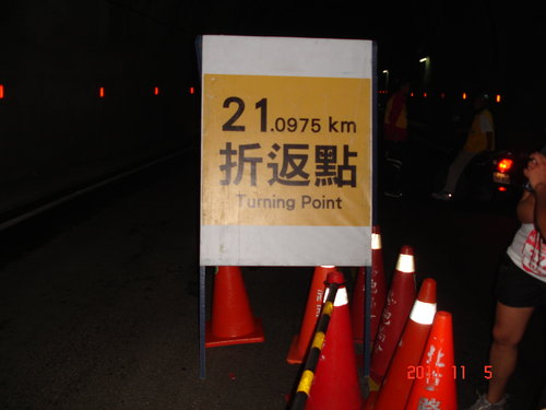 進了溪畔隧道內,好暗啊!可是看到了折返點標示,心中輕鬆了不少,至少讓自己知道還剩多少路要跑。
