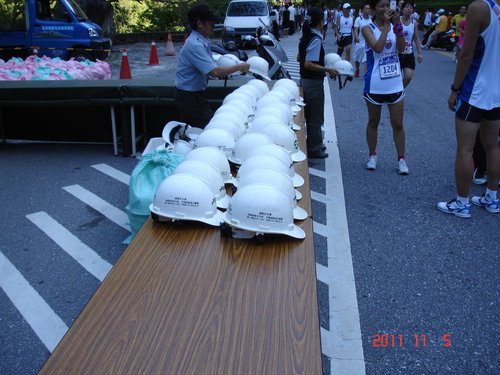 也不知跑了多久,幾都忘了時間的存在,原來前方不遠之處,快到了折返點了,太管處有準備安全帽給跑者使用,當時我還不知道跑者可以戴著安全帽跑回來,那頂安全帽可以帶走做紀念品的,不然我就戴著跑,當然我有戴著安全帽自拍,我長得這麼醜,所以沒POST出來嚇人了。
