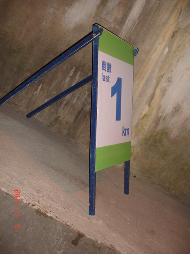倒數一公里的標示,現在的自己對一公里的路程一點感覺都沒有,想起當兵時,跑五公里都覺得難受,現在的自己若跑五公里,可以快步當飛,人真的需要訓練才行。