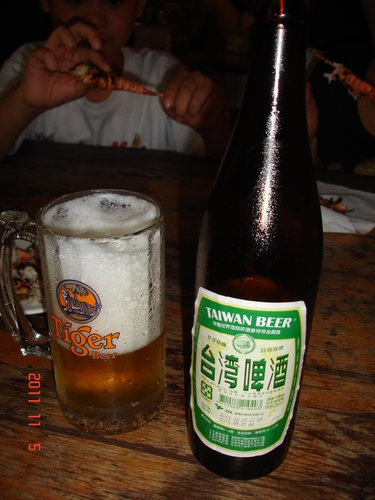 晚上在自強夜市吃燒烤,家人因為我愛上的跑步,而能跟著我到處走,他們吃吃喝喝,而我只要有這台灣啤酒就滿足了,這是人生一大樂,完成了艱難之事後,來瓶啤酒。