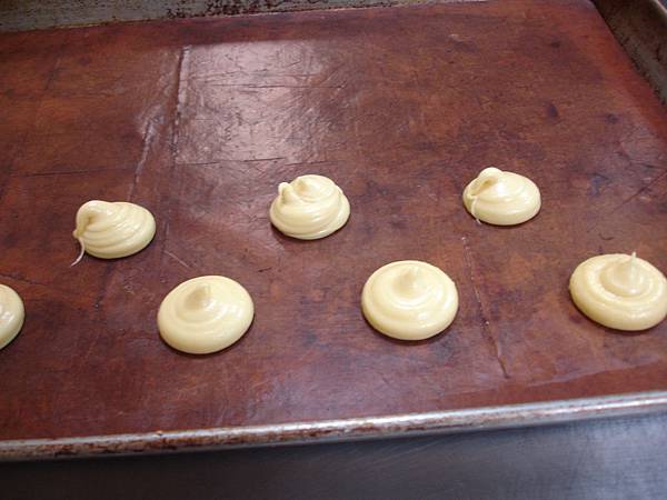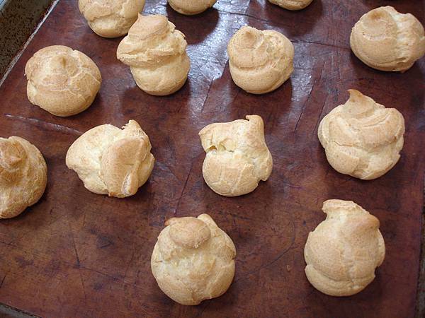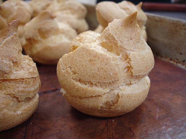 而泡芙的餡,根據老師的說法,這餡的作法,跟車輪餅的相同,太高興了,我吃車輪餅只愛奶油餡的,每到萬丹去吃紅豆餅,紅豆的口味都是女兒吃的,奶油的才是我的最愛,每到夢時代的地下餐廳區,看到那家叫關北紅豆餅的店,我都會去買一塊來吃,因為不吃一塊,回家都會難過得出現遺憾感,為何愛奶油餡,沒有什麼,這也是記憶裏的味道,小時候我在傳統市場長大的,在市場裏早就習以為常,那裏有什麼攤位,賣什麼東西,連老闆都認識我,知道我是那家的孩子,每經過賣紅豆餅的攤位,都被那撲來的香味吸引,吃不到的最好吃,口袋裏空空,父母親工作辛苦,那敢去要求他們買給我吃啊!忍住不吃,這個因子在心中形成,如同牛肉麵一樣,當年吃不到的東西,變成我這一輩子裏最愛吃的東西。
