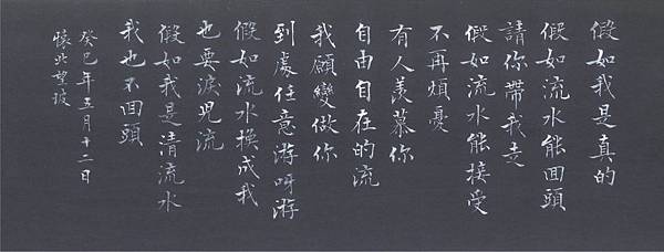 要過與眾不同的生活,套一句我老婆常說我的話,說我這種人曲高和寡,其實她不懂我的心,人想要脫離當時的環境,必然得從自己先改變,我身邊的朋友沒有一個有這般修養的,連古典音樂都不懂,而自己也沒有門路來學習,也沒有錢去請別人教,土法煉鋼,相信勤能補拙,只是用這種方法,浪費了不少時間去摸索,雖然自己沒有真的學到了精髓,但學會了鑑賞也不錯,至少我會欣賞美的事物,願意靜下心來在美好的東西上面多花些時間,所以我心是快樂的,字寫得不好看,但我還是願意寫,字不好看卻是我的風格,每個字上頭都有我的用心。