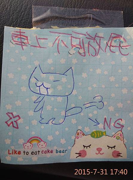 女兒的腸胃超好,還是不好,這個不是我的問題,而是要去問她每天到底都吃些什麼東西,還是個性使然,想放屁就放屁,這點雖然我也有這個問題存在,但我在一些場合可是很克制的喔,可是小咪可是對家人完全自在的,尤其是在全家都在的車子小空間裏,我問她為何在電梯裏不會放屁,她說有別人在,很不好意思的,所以都會忍到電梯門打開後,忍到較沒有人的空曠處才得以解放,我說,真是夠了,為何要放屁給全家聞呢?這樣子太沒有道德了吧,但她說在車子裏,就是忍不住嘛,我說難道你欺侮我們囉,請給我們一些清新的空氣吧!這回我們要到桃園去住她大舅舅的家,因為要做一次的北部二日遊,我千交待萬交待,要她不有良心,尤其是對家人更要有良心,要她比照我去跑馬拉松,她畫給我的免落馬符,那符還經過家裏的金貓神加持過的,所以現在的我很久沒有落馬了,要她也畫一張車上不可放屁符貼在車子裏,她說若沒有用呢?我說,符令沒有用,代表著你的功力太深,至少可以用來做警語的。