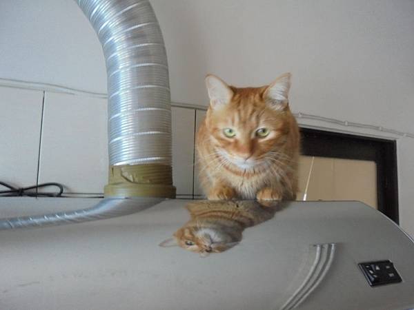 當然不只會佔領我的書桌,還跳上了吸油煙機上頭,這個地方是牠的跳板,利用這上頭,跳到更高的櫃子上頭,尤其是冬天,牠最愛爬得高,夏天時,睡在地板上較涼爽,冬天要在高處觀察。