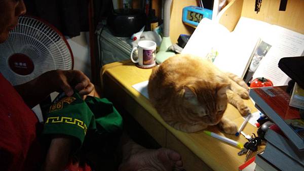 為何說阿橘大膽,就坐在人家的書桌上頭,要別人怎麼做事呢?你老大的屁股夠大,有沒有想到妨礙到我來讀書,這是阿橘的習慣,貓就是這個樣子,想怎麼樣就怎麼樣,真是可惡,想把牠撥下去,牠老大也不甩我,還好貓科動物有一個弱點,就是怕吵雜聲,拿起我的笛子在牠旁邊亂吹一通,牠就跑掉了。