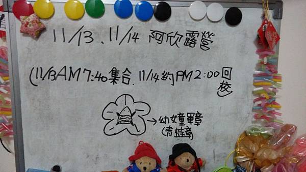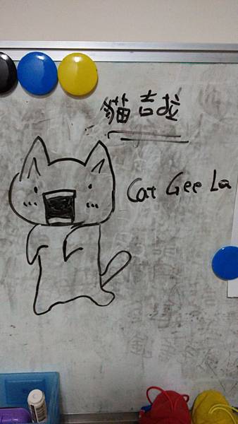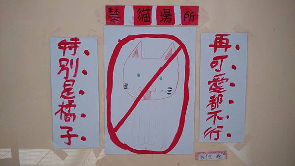這張是貼在房間門口的,現在早被橘子用牠的利爪給撕毀了,因為牠不爽,起因於媽媽不讓牠進睡覺的房間裏,所以女兒就畫了一張禁止令,貼在門口的下方,好讓橘子的高度可以清楚看到,說房裏是禁貓場所,可是在外頭打雷或是有廟會放鞭炮時,還不是讓牠進來躲,心腸還是軟的。