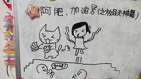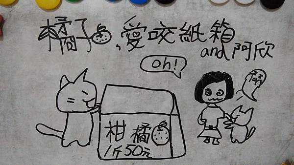 家裏頭,橘子不敢咬媽媽,最愛追著女兒跑,沒事就會出牙來含住她,所以才會有這張抱怨圖,每有紙箱都會讓橘子進去玩,紙箱裏,也是橘子發洩情緒的地方,牠在進去之後,都會先抓一抓裏頭的紙,咬一咬後才會安心地躺在裏頭,再來就是放屁天神,說過女兒最愛放屁了,我告訴她,你的等級不只是達到屁王級,應是到達天神等級,所以是放屁天神,我發明了放屁天神舞,這是我跟女兒才會做的動作,因為很好笑,她這畫來為我加油,為了跑馬拉松平賽,還有看完哥吉拉電影後,把橘子畫成喵吉拉的形狀,也真有創意。