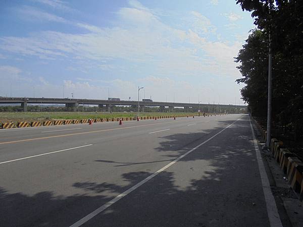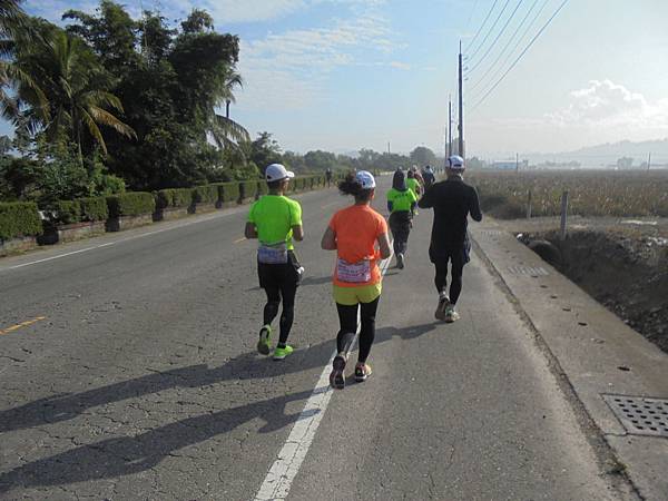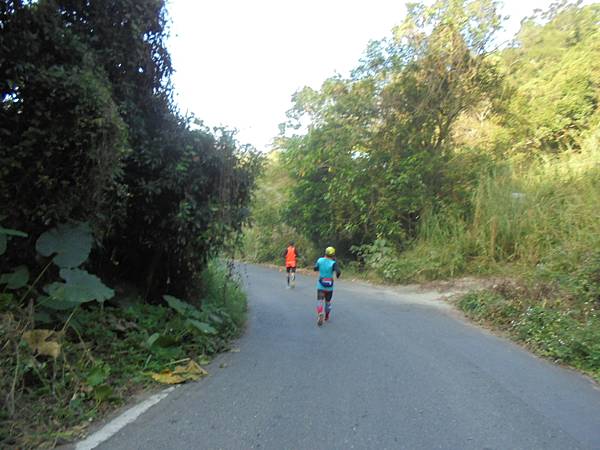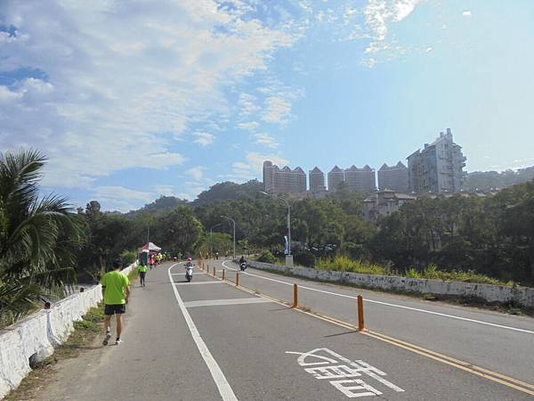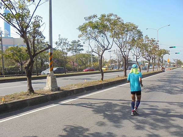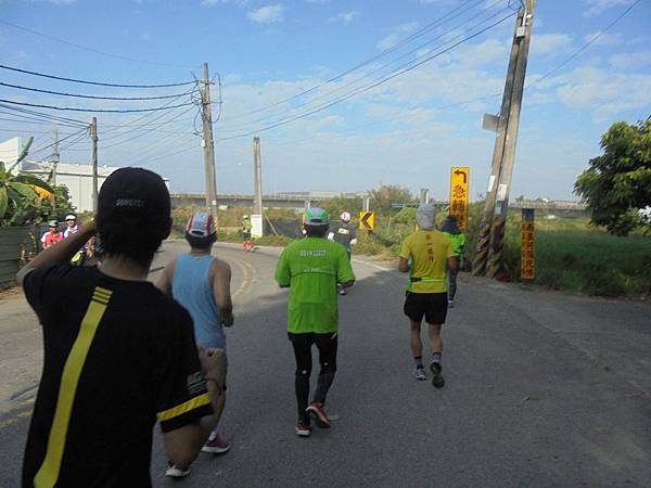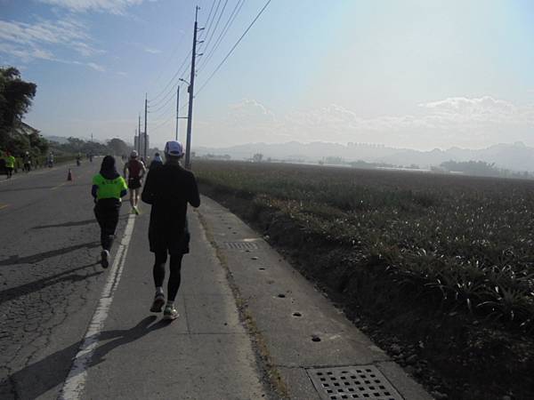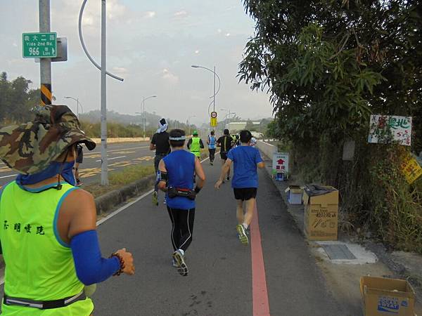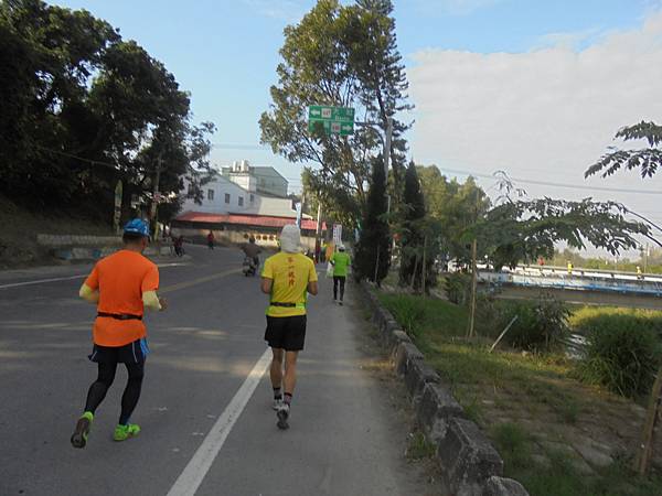看到高屏溪旁那條主要道路了,到了折返點,往回跑是爬坡,緩坡還是坡啊!套了剛來的話,怎麼來就怎麼回去,這時我那腳底板開始時,也許沒有拉開放鬆,不時有緊繃感而感到不適,這時都十公里過了,腳筋也熱身,筋骨應也慢慢適應。