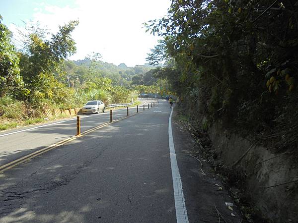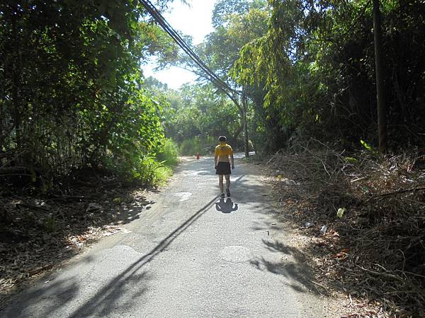 從義大世界旁的小路彎進去,也就是要去觀音山高爾夫球場的路,高爾夫球這運動,也不適合我的,一來要很大的球場,再來要很高的會員費,花了很多的時間,沒有流多少汗,我要的是能讓我身心都激昂的運動,這條小路很涼爽,樹蔭多,然而剛才那天空多雲的狀況開始不見了,轉而是太陽變大,耐力運動遇到大太陽,真的很難受的。