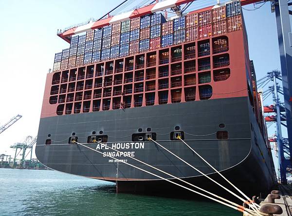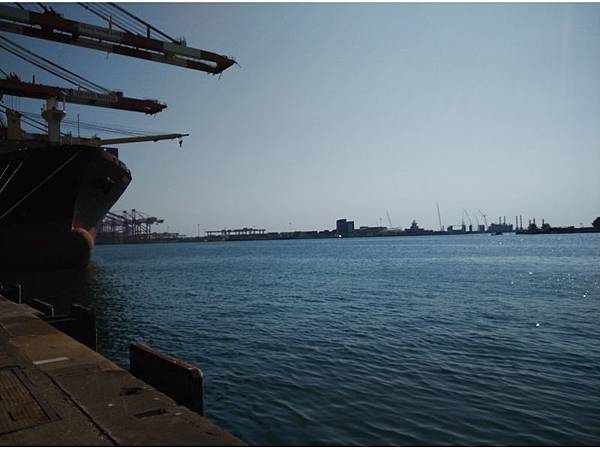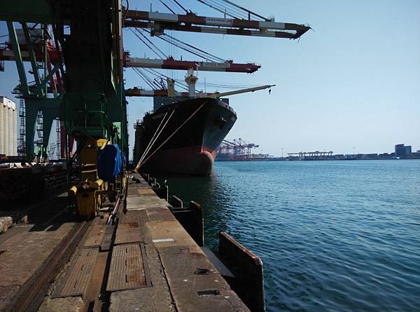 很少來到船邊了,現在不像過去剛進到這個機關時,對碼頭這麼好奇了,當年沒事就到船上到處晃晃,說真的,現在想想,人家在做貨櫃裝卸時,是有一定的危險的,而那時的自己好奇心勝過一切,反到到船艙及駕駛艙那兒,離開裝卸區,一定比較安全的,現在的自己只會遠遠地看而已,然而看著這些很重的貨櫃及這麼大型的機具在運作,內心還是會有些激昂的,有些行駛國際大洋的貨櫃輪的長度,都跟航空母艦差不了多少,我量過喔,大型的船都有三百五十公尺長的。