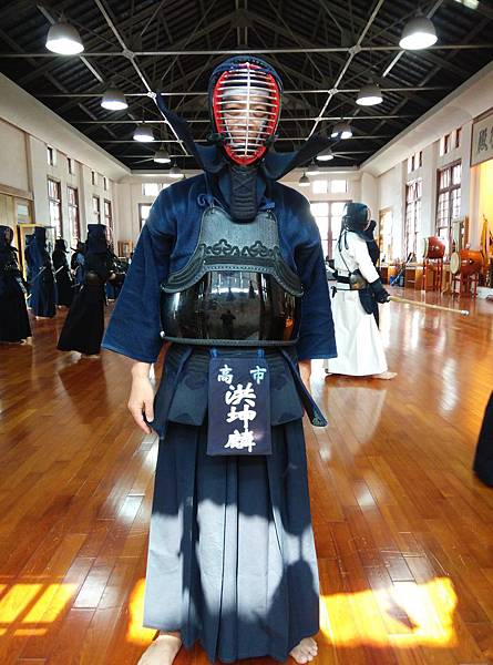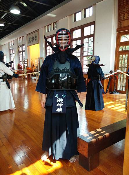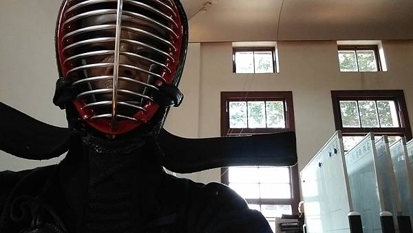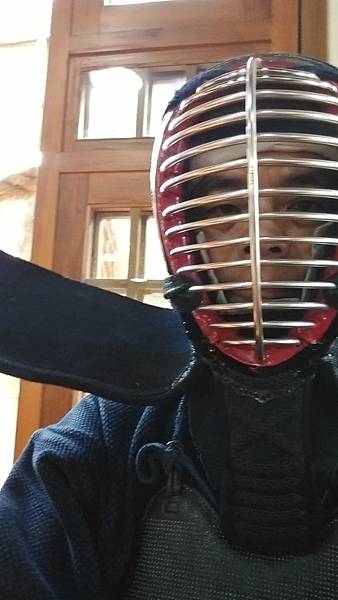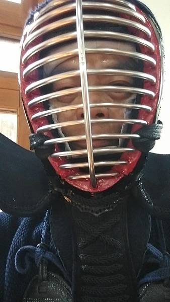 利用等待跟高段者切磋的空檔時間,為自己做自拍一下,劍道跟跑步不同,跑步我可以一面跑一面拍風景,劍道因為全身穿著護具並且雙手持竹劍,除非有旁人幫你照相,也不像路跑賽事主辦單位都會有專人等跑者拍照,所以我打劍的相片留著不多,我用谷歌搜尋過我名字,真的大部分跟我有關的都是跑步跟劍道,因為我最常參加這兩種活動了,機關裏的活動參加得不多,有幾次我想到台北去受長訓,最後都放棄,不然有些資料也會在搜尋引擎上顯現出來的。
