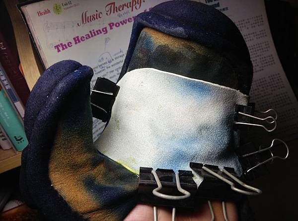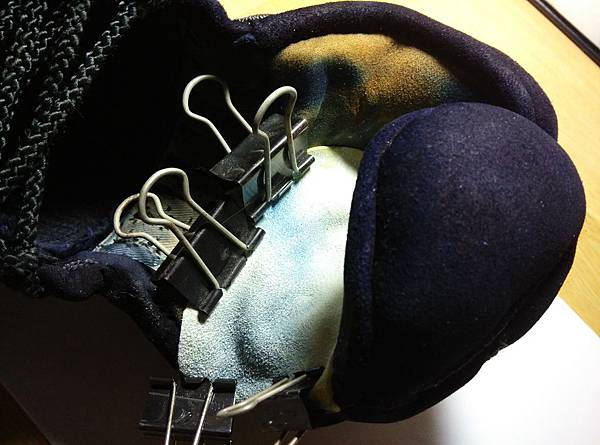 黏好後用夾子夾好,又可以用一段時間了,愛跑步的人,總會磨損鞋子,每一段時間就得換鞋,懂得整修運動必需品,可以把用品延長使用期限的,反正我又不是把運動用來炫耀用的,可以用就好,心想著那位在頭盔上有愛的愛將軍,到底穿著這套甲冑時,心中到底是什麼感受,我不能得知,但我站在物盡其用的份上,其實是省錢啦,經濟條件不好,能用加減用就好,反面補皮是藏在握皮那兒,百納衣的甲手,別人也看不到啦。
