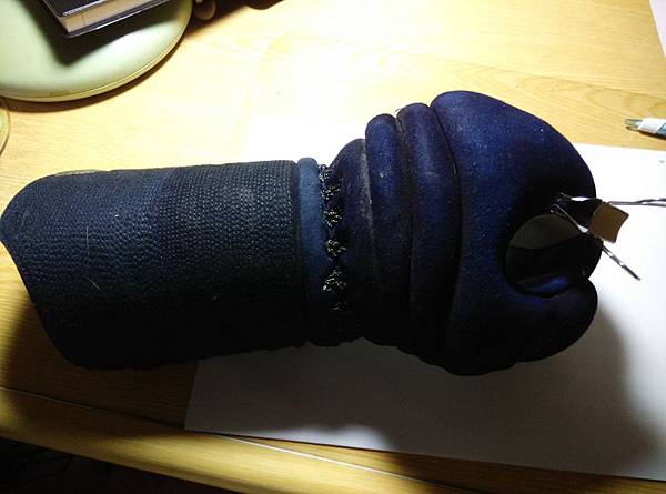 再來說甲手,我這回在握皮部位破個洞的這一個,一副六千元,單一個就是三千元囉,有人問我練劍道,依我的經驗那一部位的防具最重要,我都說甲手,很奇怪的,面還是胴被打到時,不論受擊多大,不會感覺到痛及不適,但打擊到小手,真的痛到不行,面對高手時,被打到還能被準確打到防具部位,常有新手亂打,都會打到沒有防護到的手部位,超痛的,淤血青黑一片,大都在這兒,會淤血的地方還有被打胴時,被打得太高,腋下可痛得,打得太低則大腿靠腰部位就是一條黑,垂這個東西,說真的,防護效果不大,只是把痛及淤血減少百分之二十大概。現在家裏有二副甲手,一副在幾年前送出去把握皮部位全換新,現在這副也開始有壞掉的跡象,甲手都是先壞在握皮,再來就是拳的部位,拳的部位裏頭裝的是鹿毛,那是最好的品質,若裝的是爛綿,那手的痛是難以忍受的,這就是我常說劍道最痛的在手,過去我還有手被打中,幾天裏連背包都拿不起來的情形,完全失去了手力,可想有多痛了吧!汗水會脆化真皮部位,加上經常使用而磨損皮質,所以握皮是容易壞的,基本上我過去在小洞出現時,都用竹劍的握柄皮用針縫補,但用針縫這厚皮很難,得沾油再使力才能縫一針,後來我想反正補起來只能再用上一年多,用強力膠黏起來的效果也不差,因為我當兵快退伍前,我有一雙皮鞋給來營區的鞋匠修底裂的地方,他用強力膠黏上一層橡皮而已,我還用了好幾個月都沒有壞,依然堅固,所以我才會想黏起來就好,不用針線花了好大的功夫來縫。