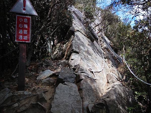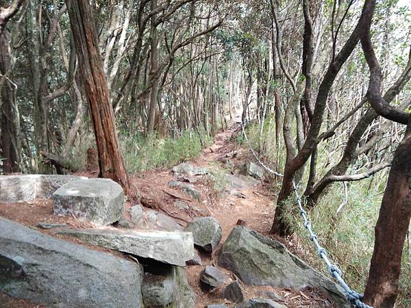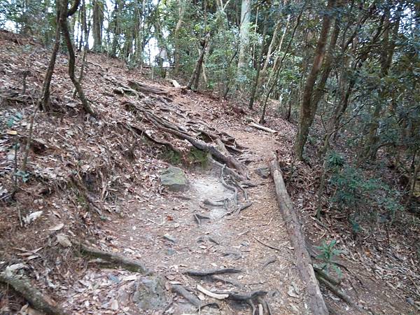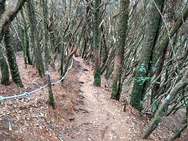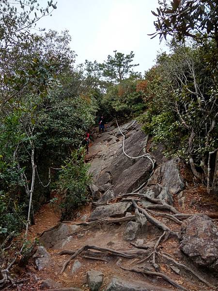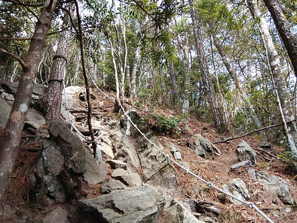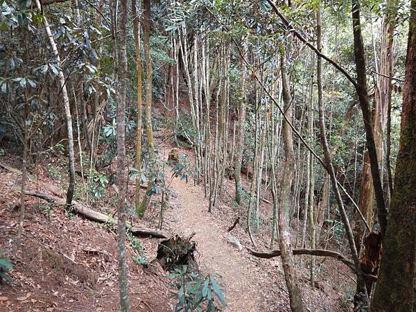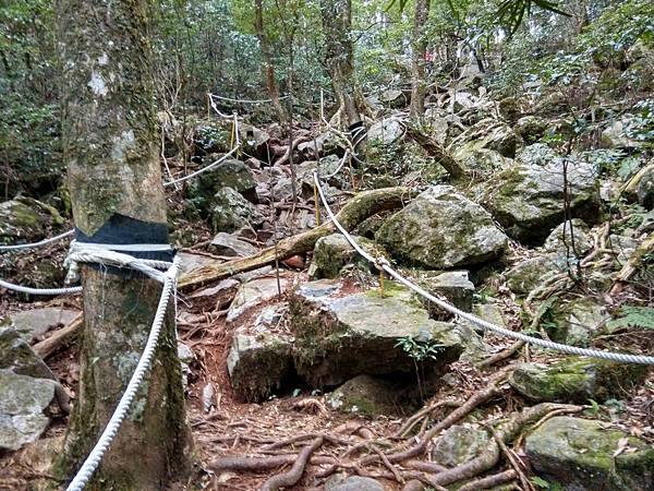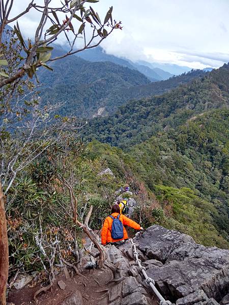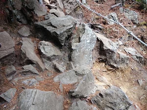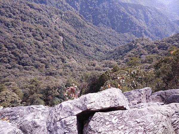 有時光看網路上的圖片,還是貼文不能感受到現場狀況的,一個新的山林裏,我總是想多走些地方的,家裏的兩個女生不愛運動,剛開始走步道,就面露難色了,但山裏步道有個好處是,走了之後,要再回頭也得再走相同的路,尤其是過了一半後,不可能切西瓜走捷徑,開始時我認為路算好走,但我穿著襪子不停地縮到鞋裏去,就知道我穿品質很不好的襪子,其實我跑步也穿,但不會發生這種情形,大概是因為上坡的腳方向是斜面造成的吧!每走幾步就得去拉出襪頭,很麻煩的,走步道有斜坡是正常,結果路越走越小,在最後的路變成要不停地攀岩,而且攀登的使力點及腳踏點不明顯,若踩空會發生嚴重傷害的,看那樣子若墮落會有三十公尺以上的落差,受傷後要救援下山很麻煩的,所以越走越慢,因為每一段的攀登都費了不少時間。