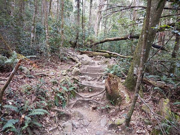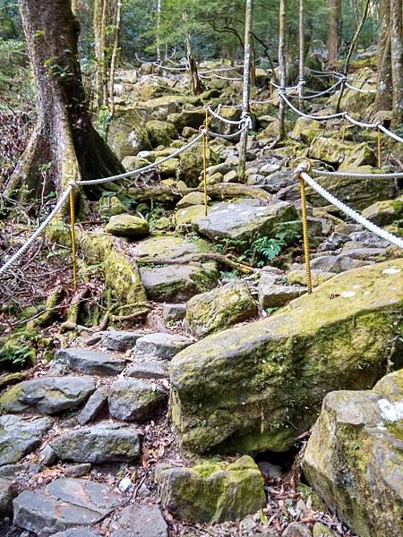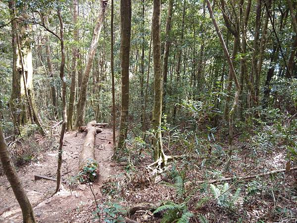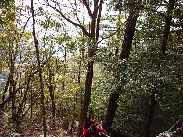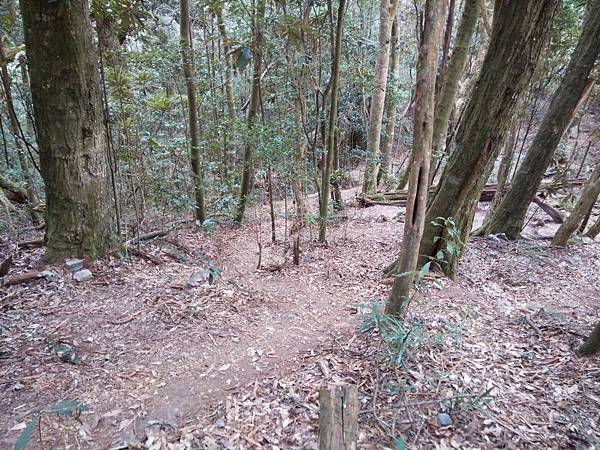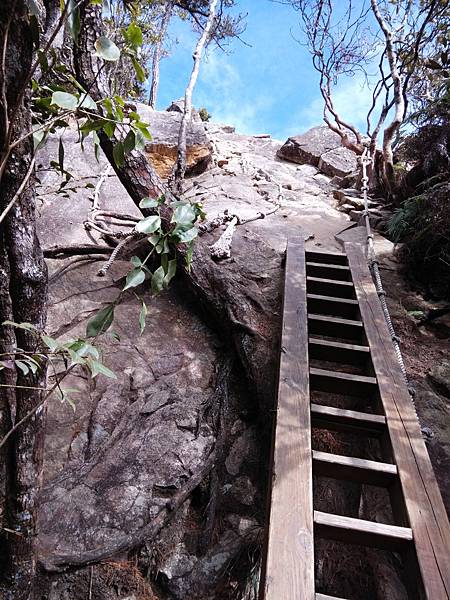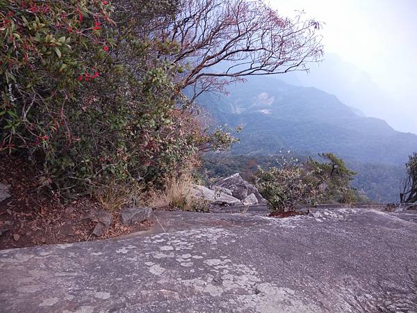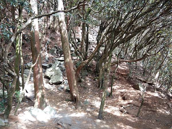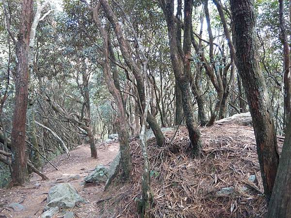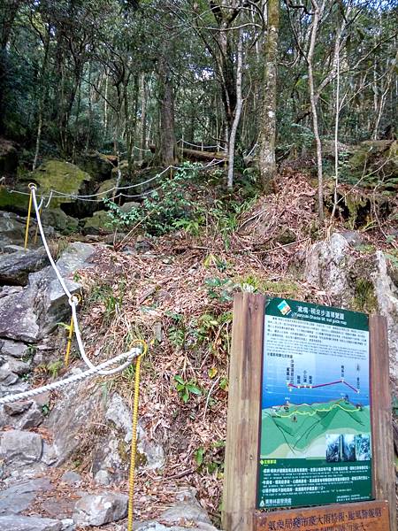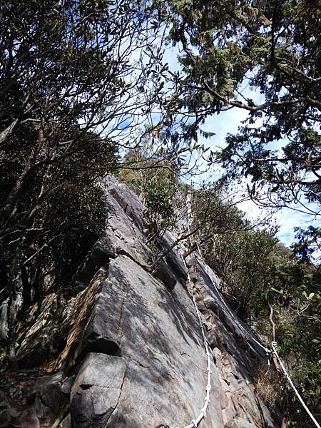 有時光看網路上的圖片,還是貼文不能感受到現場狀況的,一個新的山林裏,我總是想多走些地方的,家裏的兩個女生不愛運動,剛開始走步道,就面露難色了,但山裏步道有個好處是,走了之後,要再回頭也得再走相同的路,尤其是過了一半後,不可能切西瓜走捷徑,開始時我認為路算好走,但我穿著襪子不停地縮到鞋裏去,就知道我穿品質很不好的襪子,其實我跑步也穿,但不會發生這種情形,大概是因為上坡的腳方向是斜面造成的吧!每走幾步就得去拉出襪頭,很麻煩的,走步道有斜坡是正常,結果路越走越小,在最後的路變成要不停地攀岩,而且攀登的使力點及腳踏點不明顯,若踩空會發生嚴重傷害的,看那樣子若墮落會有三十公尺以上的落差,受傷後要救援下山很麻煩的,所以越走越慢,因為每一段的攀登都費了不少時間。