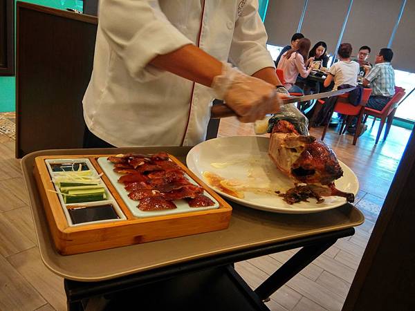 到那兒都快下午二點了,還好店家還願意接我們這組客人,怕的是打擾到服務人員的休息時間,我們會變成不受店家歡迎的人物,我這個人寧可不吃也不想讓人困擾的,每在新聞媒體看到奧客成群,總想著這不是我的型,人因價值觀而有所不同的行事風格,都看你的環境及長輩教導所致,在桌邊片鴨,我印象是在北京吃烤鴨時,有做這服務,因為鴨皮油在還在有熱度時最好吃了,當然這以港式的烤鴨製作,與北京的還是有些不同,一定還要叫些港點才行,原本我也不吃港式點心的,也是因為老婆大人的關係,碼頭有朋友說我平常這麼省,一定買了幾棟房子吧!我說我家有人幫我花錢,房子不用多,夠住一棟就好,其他的就給家人吃好的美味食物吧!給他們舒壓快樂的心情。