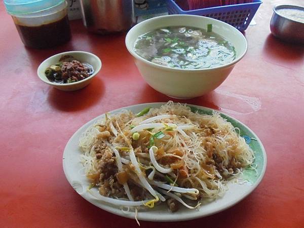 鎮南宮前的米粉配豬血綜合湯是我的最愛,酸菜味的湯,加上很多蒜泥及豆瓣醬,當然還要有蔥與辣椒的醬油,我的飲食習慣啦,有次老闆娘問我湯會不會太鹹,我說我完全不怕鹹的,我不會對吃的挑剔,即使端上來的不鹹,我會加其他調味的,像是去吃牛排,我最愛加鹽粉了,我有在運動,吃鹹些較沒有關係,倒怕不夠鹹,電解質不夠而造成身體疲累或容易抽筋才不好。