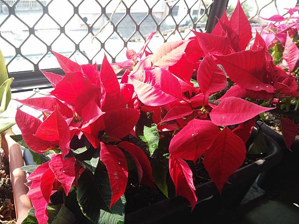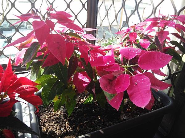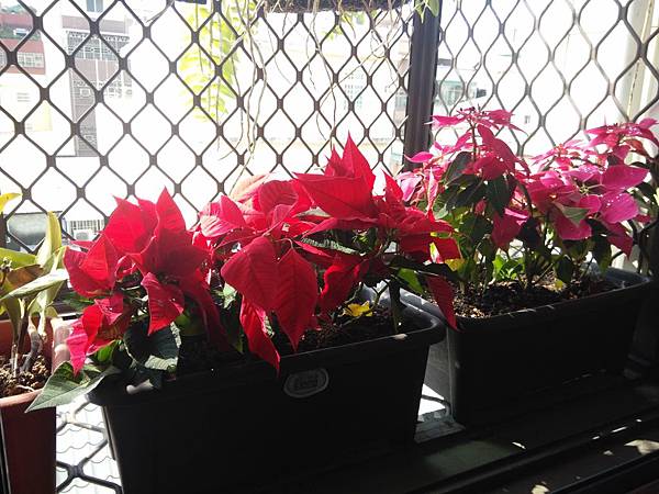後來我因為怕在樓上澆水會因為滴水下來而弄髒了牆壁或是影響到路人,樓上的盆栽都改種水苔來做為介質,泥土之類的的盆子都移到樓下去,放在門口,家裏現在可以擺放的地方都放滿,所以也沒有閒功夫再去花市買新的花來種,但花草還是會凋零,總等到盆子裏的花長得難看時才會想再去整理,這是就是再買新的植栽來的時候,每年都會在年底前種些聖誕紅,至少讓家裏有些顏色,不會有整個房子單一色的無趣感,在勞工公園花市就是找不到去年的一種顏色,我記得是有些白斑的紅色,今年看到的都是紅色的,但我還是要區別出來,所有有另一個較淡的紅色,也許是今年較早去花市!聖誕紅還沒有大量出貨到花市吧!