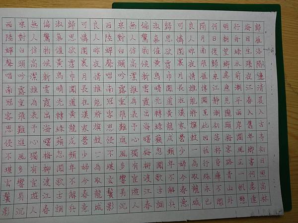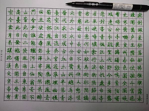 在書店裡有些硬筆同好們也會介紹一些好寫的筆,所以以原子筆為主的練字,原子筆便宜又好寫的品牌也有喔,每到假日都是我大量寫字的時間,我不太挑筆寫的,近來對毛筆有興趣,今天這筆是從小朋友不要的筆裡拿來加墨水寫的,筆頭是一體成型圓錐形的軟塑,不是毛製的喔,寫起來的手感我不喜歡,像是傳統毛筆有狼毫兔毫及羊毫,每種手感都不同,如同劍道拿竹劍或是碳纖維製的,其實碳纖維製的好用,但手感不好,不就是一種習慣而已,每寫完一張就放到紙箱裡,也寫了好幾箱了喔,田字格小字及田字格大字風格也不同,四方格用PILOT紅墨水筆寫又不同感覺,老樣字,我寫毛筆最討厭磨墨洗筆了,所以我都寫日本的加墨式毛筆,一年寫五十支筆,好像剛好。