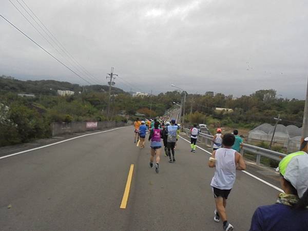 這個長坡下去後,就垮了,因為腳痛被誘發出來,越來越痛就越跑越慢,下坡之後在高速公路高架的下方,雖然這段很平坦,但去程迎面而來的風很大,是面風跑,腳痛出現,所以折磨在半程前出現,實在是不利。