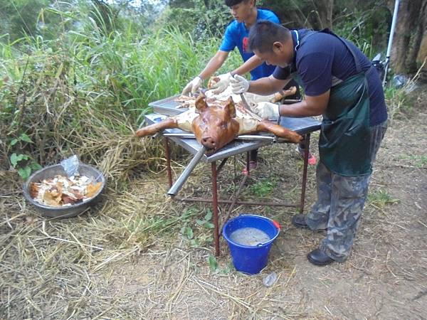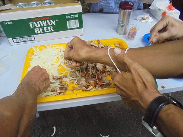 經過一長段的平坦路線,是一大片稻田,客家人真的愛種稻,這丘陵地區,都還能引水來灌溉種稻,這得要有水利的建設能力才行,老祖先們就有能力開渠道,不能小看先民們剛才一個陡下坡而已,還以為再來都是這種平坦路,想得美,慢慢的就要吃苦了,但要吃苦之前先吃補,有烤乳豬還有啤酒,老樣子,沒有回程前,我不敢喝啤酒,只是幾個小時後回程時,沒有酒可以喝了,但我先吃烤豬肉是對的,因為回程時也沒肉可吃。