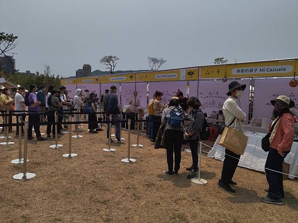 大概是這兒較空曠吧,風大了些,而好久沒有下雨的關係,草地都沒有綠意,結果大風捲起了塵土飛揚,來擺攤的店家可能不好受吧,也許我的時候在中午時段吧,南台灣只要一到了近夏天時,大家都不喜歡白天出門,若要白天出門,都會往百貨公司去,因為戶外太熱了,才走沒有多少路,就覺得汗水加上塵土造成身體溼黏感,實在不舒服,主辦單位還叫灑水車來減少塵土,招牌上的活動表,大部分的活動都在傍晚後,主辦單位有考慮到氣溫喔,看樣子日本人不少,應有日本的咖啡職人來煮咖啡吧,有不少人在排隊等喝咖啡喔。