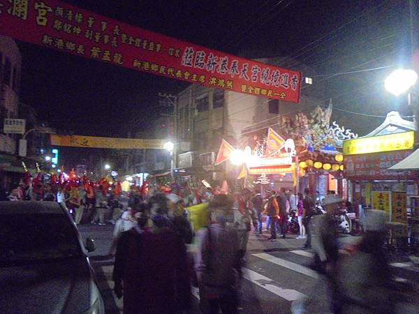 還沒走出新港,好熱鬧的拚場,舞台架設讓人們與神明同樂,只感受到人情親切,因為我們都有一個想法,在媽祖的腳底下,必須要和善人際關係,為生活努力,有好的生活,才能照顧家人及周遭人們,發揮大愛精神,在這力量之下,我們不再孤單,我們擁有彼此。