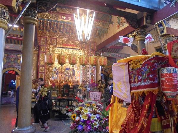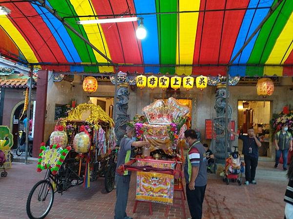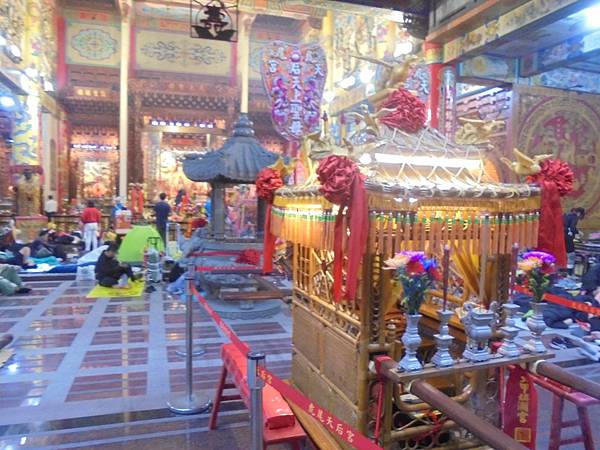 報馬仔最先行,再來是繡旗隊,一個個陣頭依序出發,原來廟裡的頌經聲也改變成司儀聲音,開始準備把媽祖請出廟來入轎,我經過廟旁的神轎旁,再鑽進廟裡去感受古禮進行的氣氛。