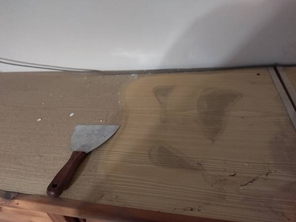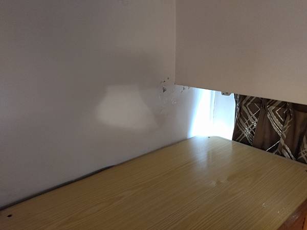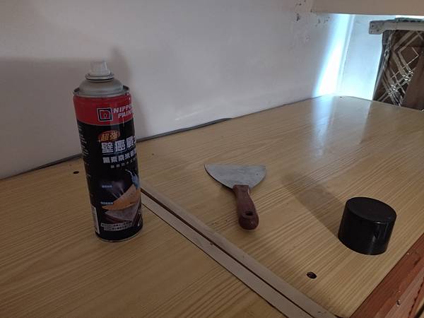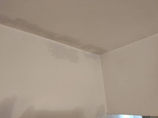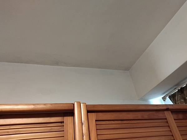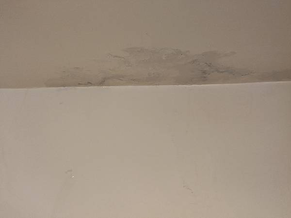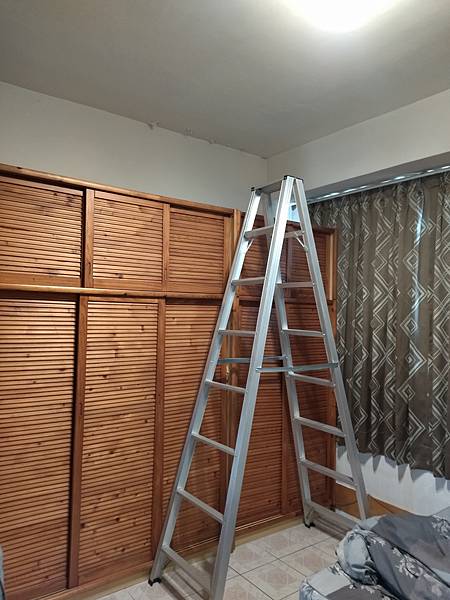 再來就是天花板的角落有壁癌現象,拿梯子來,爬上爬下的,將之刮除,要噴防水劑,再上漆。